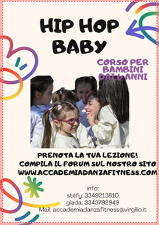 ATTENZIONE PER IL CORSO AVVIAMENTO HIP HOP 6 ANNI TEL DIRETTAMENTE AL 3349213810 STEFY PER LA PRENOTAZIONE ,NON UTILIZZATE IL FORM ,PERCHE' E' STATO AGGIUNTO ORARI MERCOLEDI' 18,00-19,00 E SABATO 10,00-11,00